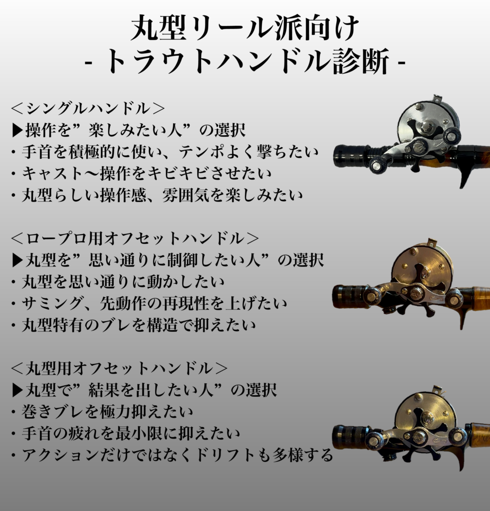 自分が丸型リールに何を求めるかで、最適なハンドルは変わります。