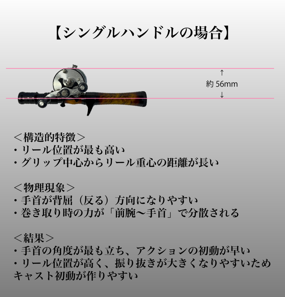 リールの重心位置、手首の角度、力の伝わり方は大きく変わります。